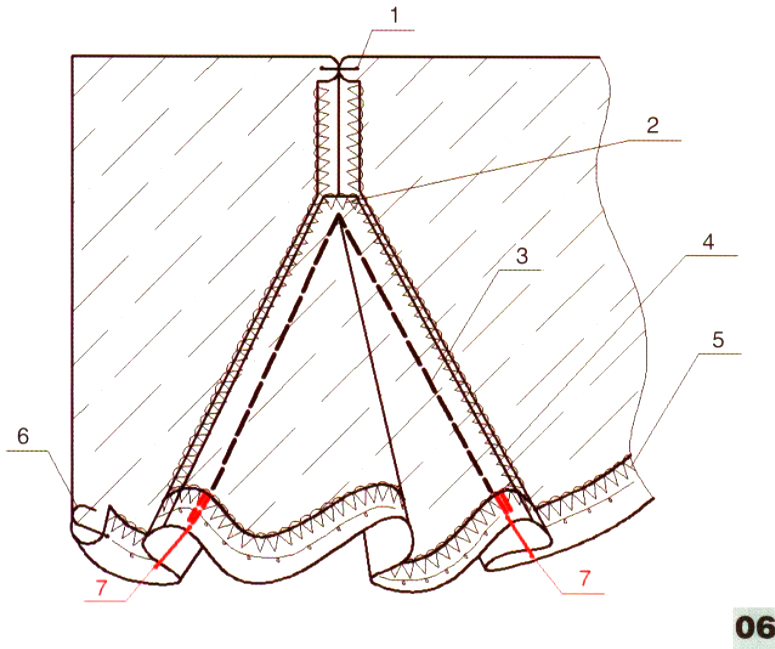 Это менее трудоемкий способ обработки клиньев. Стачать две детали изделия швом шириной 1 см (строчка 1 на илл. 06), оставляя не стачанными срезы для притачивания клина. Обметать верхний срез клина (строчка 2 на илл. 06). Притачать клин к нестачанным срезам деталей изделия швом шириной 1 см (строчка 3 на илл. 06). При обработке шва притачивания клина «на ребро» строчку нужно сместить на 0,5 см в сторону срезов, начиная смещение на расстоянии, равном удвоенной ширине припуска на обработку низа. Строчку 3 (илл. 06) прокладывать в два приема, прерываясь в верхней точке клина.