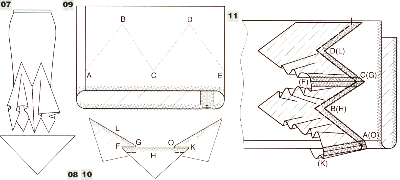 На остальных участках (FG, ОК) клинья стачать друг с другом (илл. 10). Разутюжить припуски швов стачивания. Обработать срез низа клиньев на машине зигзагообразной строчкой или швом вподгибку с закрытым срезом шириной 2-3 мм в готовом виде.